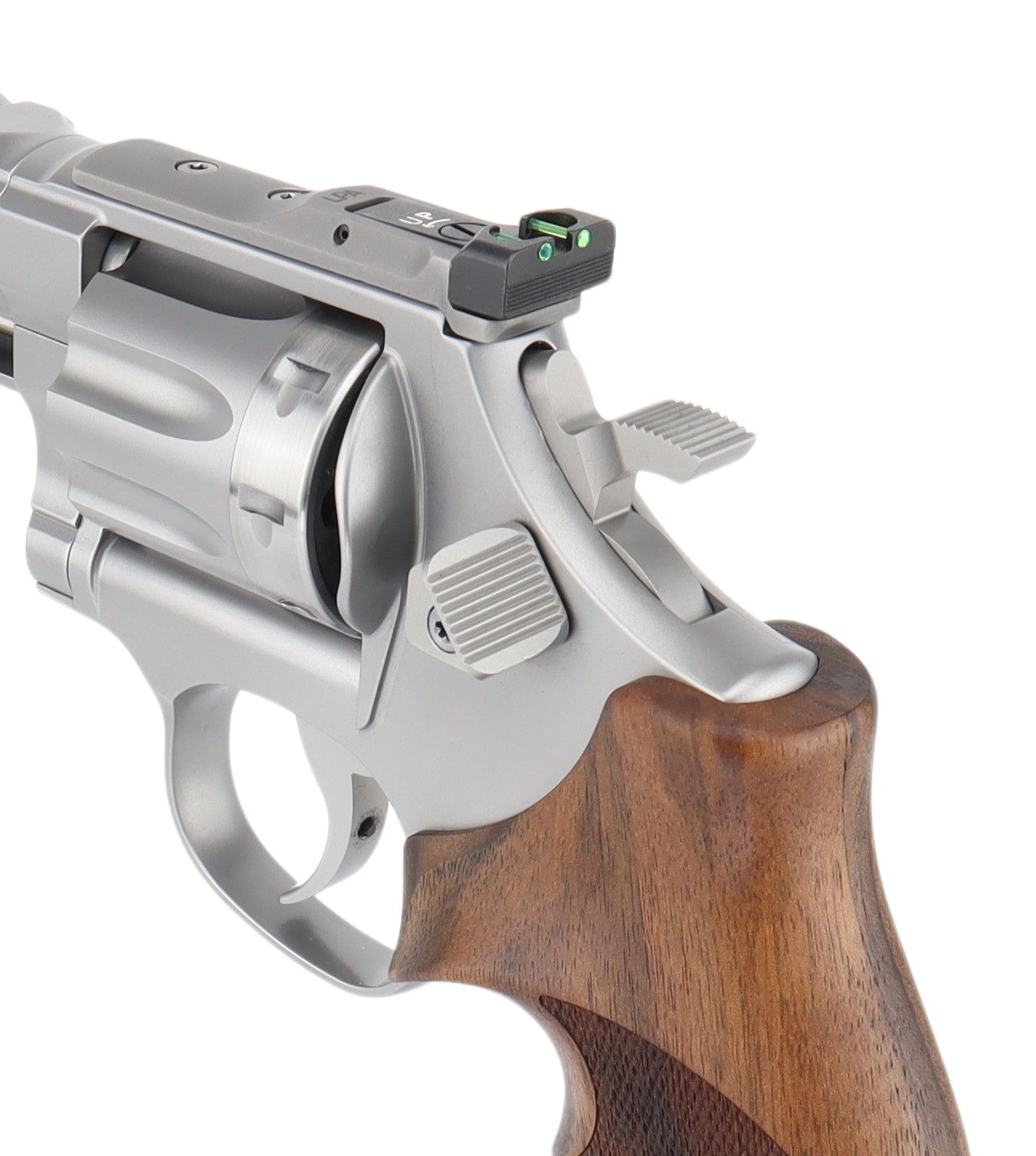 Die integrierte Picatinny-Schiene ermöglicht den Einsatz eines Rotpunktvisiers und macht den Revolver auch in „freien“ Klassen voll wettkampftauglich. Das hochwertige LPA-Visier mit Glasfasereinsätzen (Kimme & Korn) sorgt für eine schnelle, kontrastreiche Zielaufnahme unter verschiedensten Lichtverhältnissen – ein klarer Vorteil bei schnellen Disziplinen und sich ändernden Umgebungen.